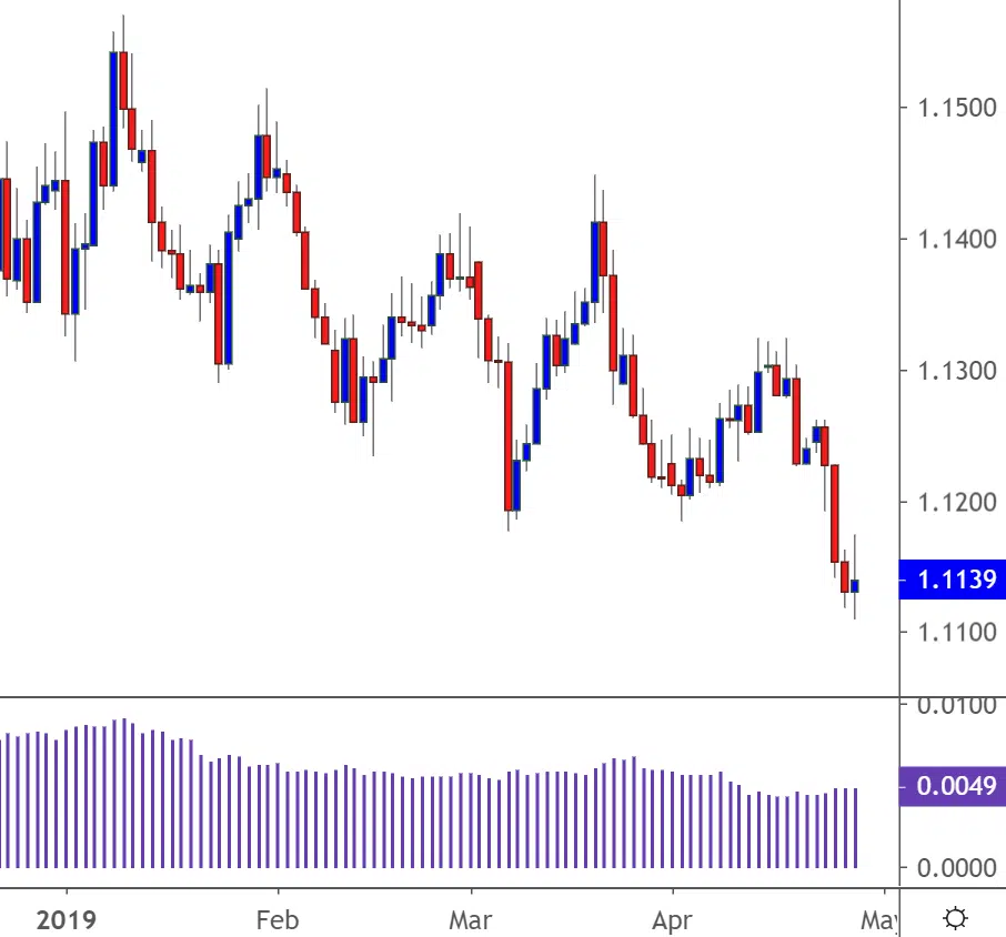Tageschart im EURUSD mit einem ATR Indikator und einer Einstellung von 14