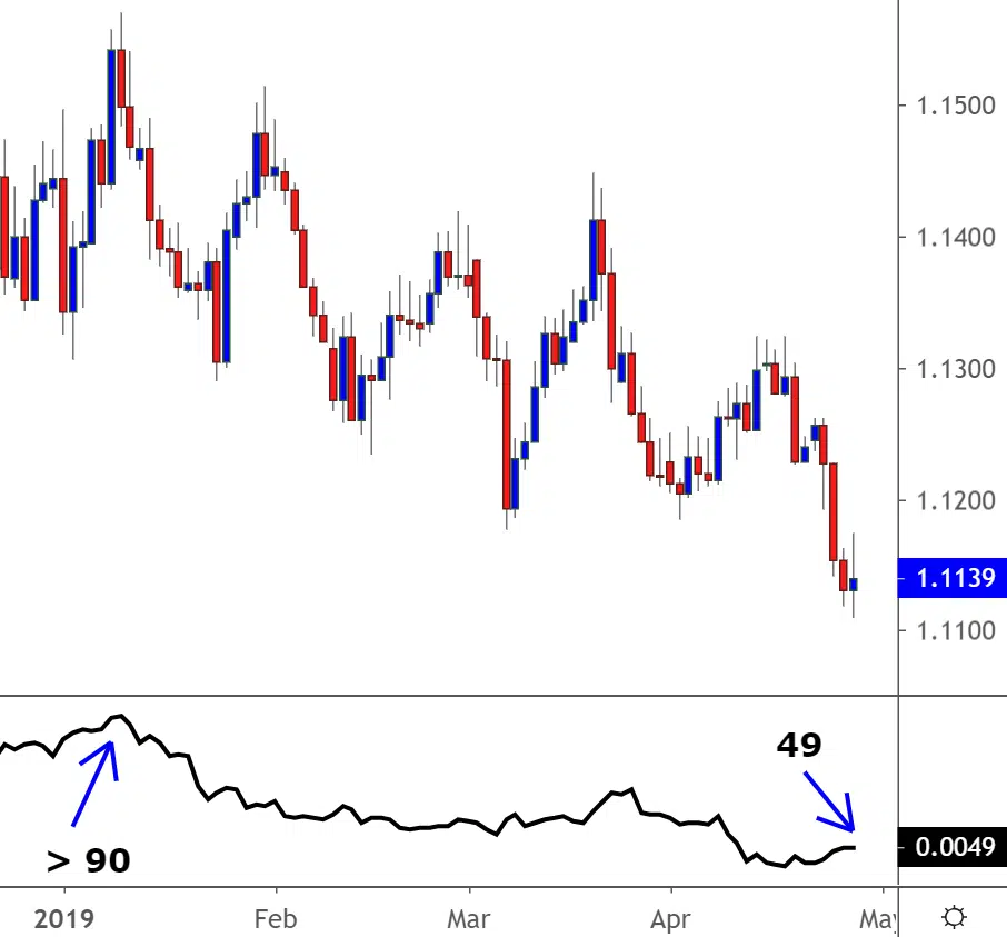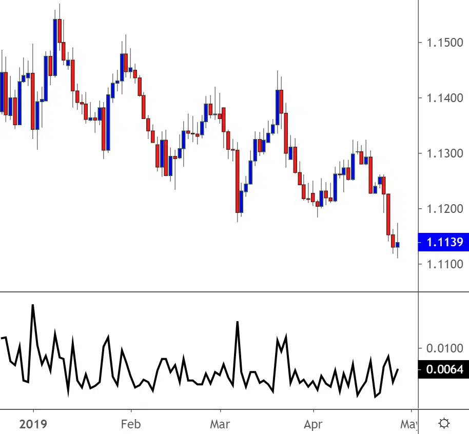 Anfang 2019 war die Volatilität noch bei über 90 Pips. Im Laufe des Jahres ist also die Volatilität im EURUSD gesunken.