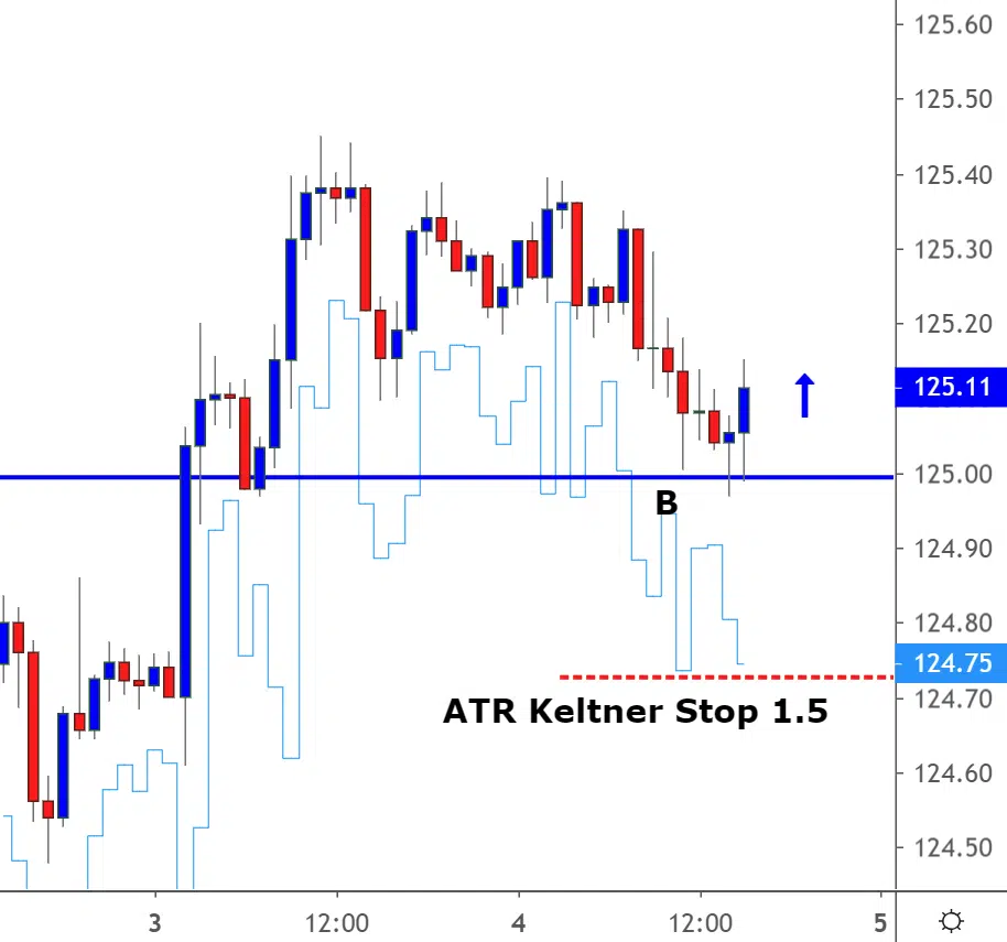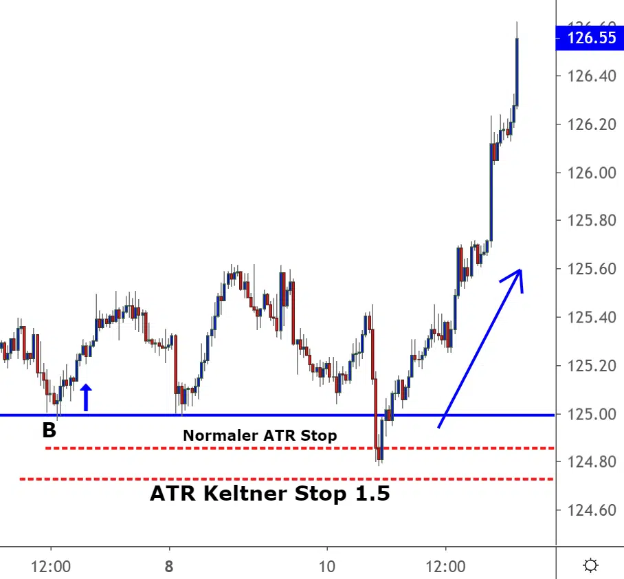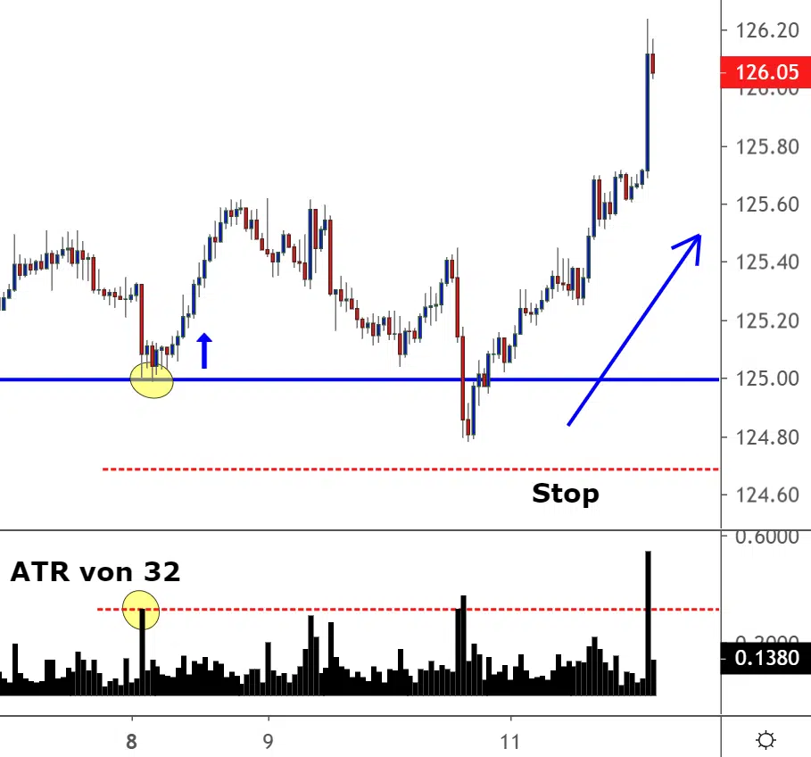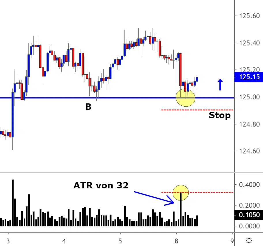 Würden wir jetzt die übliche ATR Kalkulation für einen Stopp nutzen, wäre der Stopp 10 Pips unterhalb der Tiefs. Also bei 124.90.
