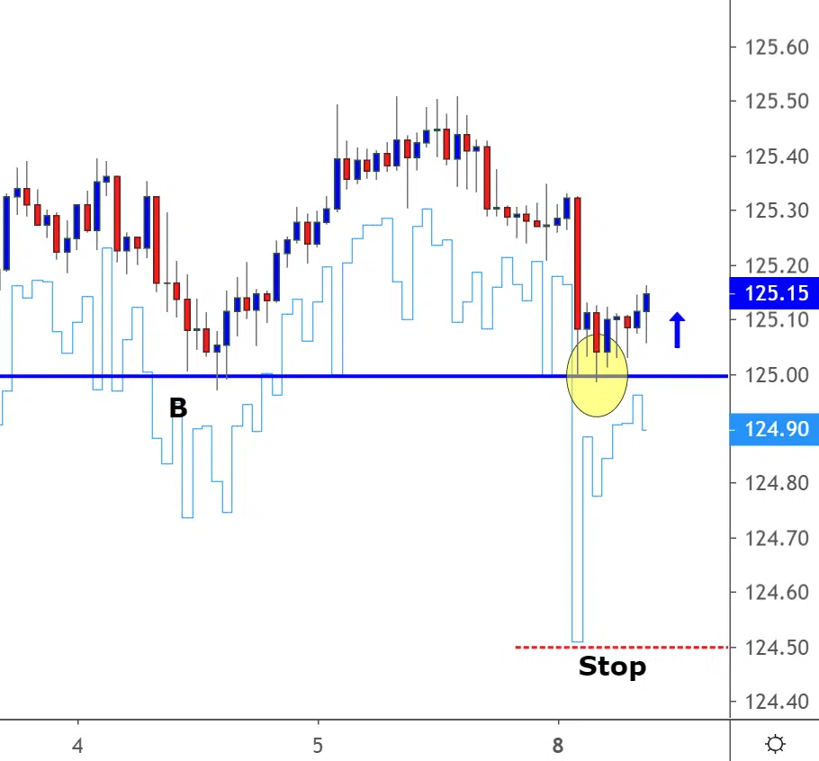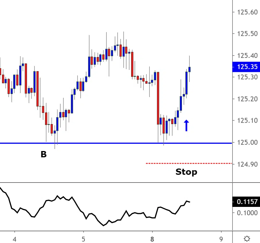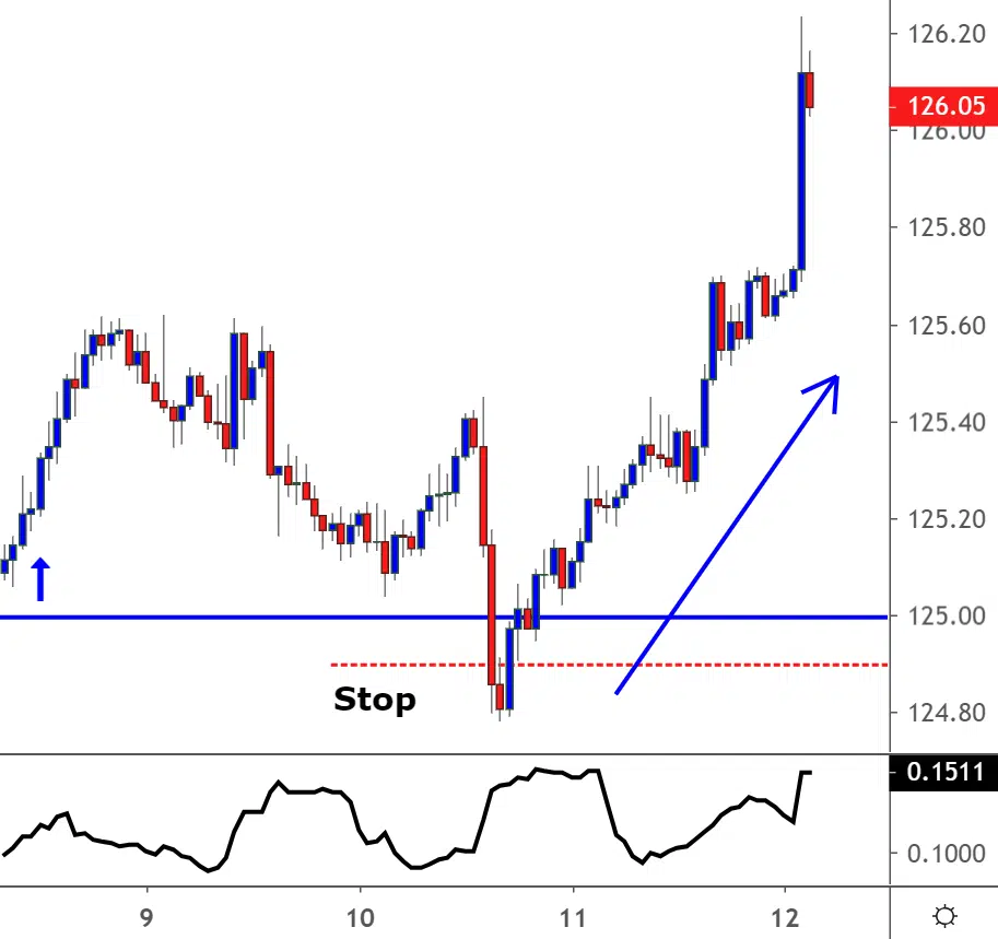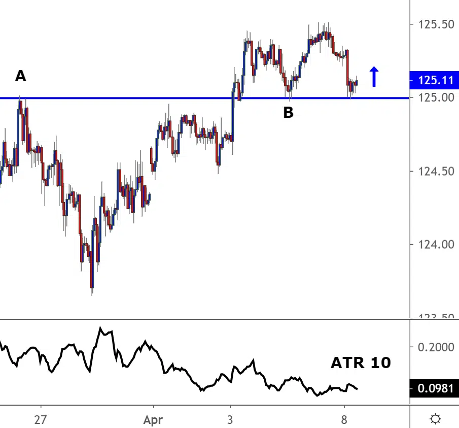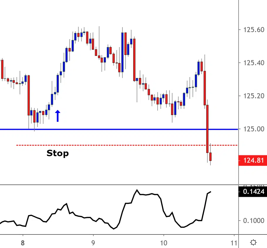 Würden wir jetzt die übliche ATR Kalkulation für einen Stopp nutzen, wäre der Stopp 10 Pips unterhalb der Tiefs. Also bei 124.90.