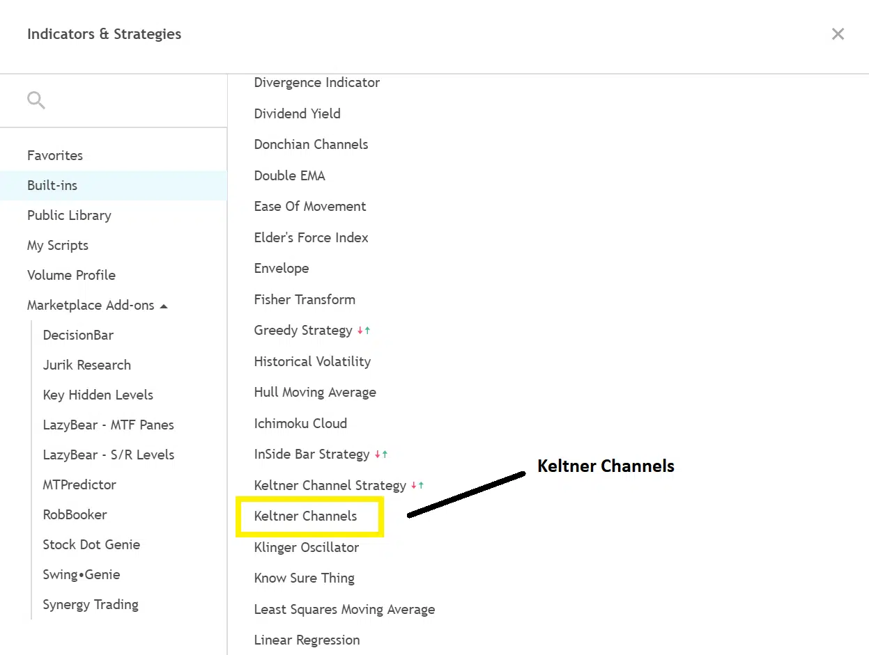 Unter der Rubrik „Indikatoren“ wählst Du den Indikator Keltner Channels.