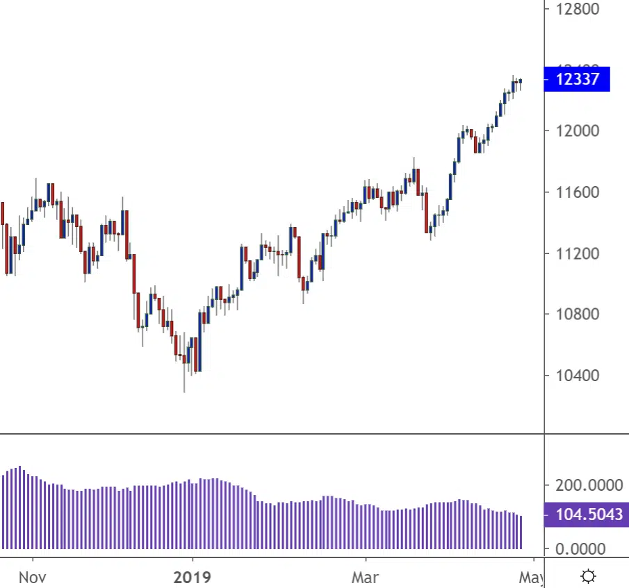 Tageschart im DAX und einen ATR Indikator mit einer Standardeinstellung von 14