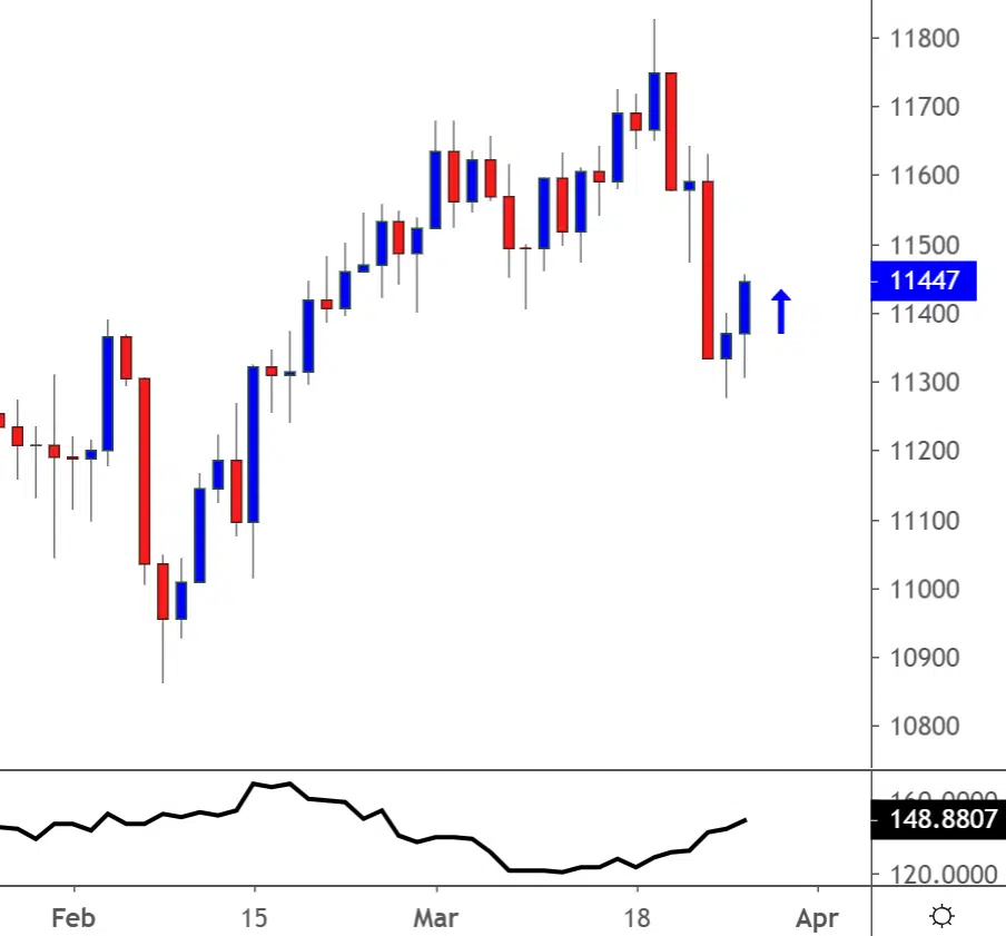 Der ATR zeigt uns eine durchschnittliche Volatilität von rund 149 Punkten an.