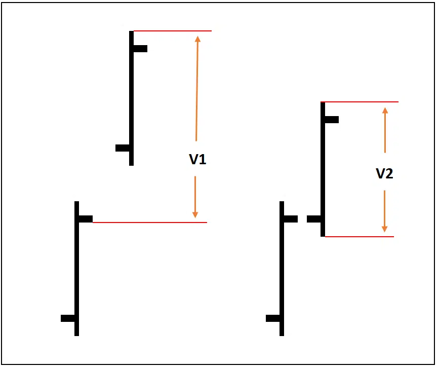 Im ersten Step wird überprüft ob ein Aufwärtsgap vorhanden ist. Wenn ja, dann wird die Range (V1) berechnet. Ist kein Gap vorhanden, dann wird die normale Schwankungsbreite berechnet (V2)