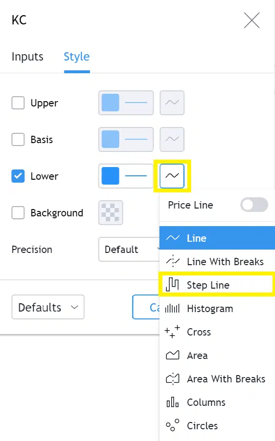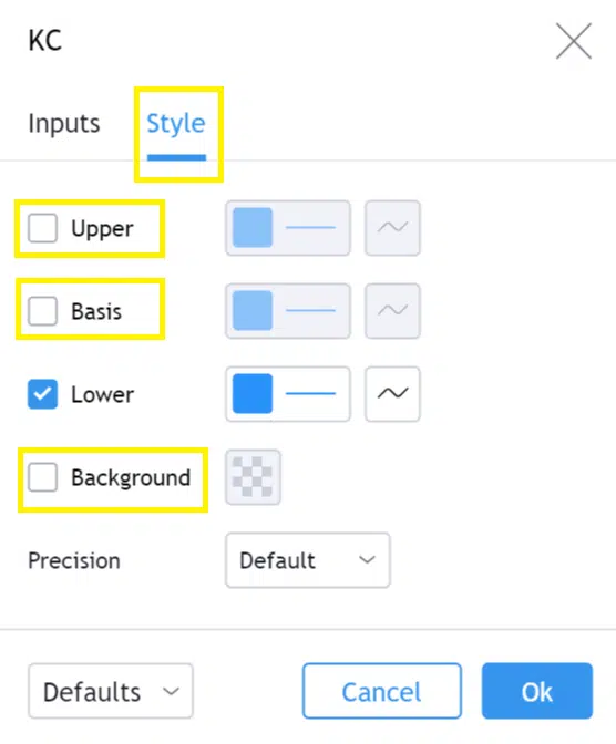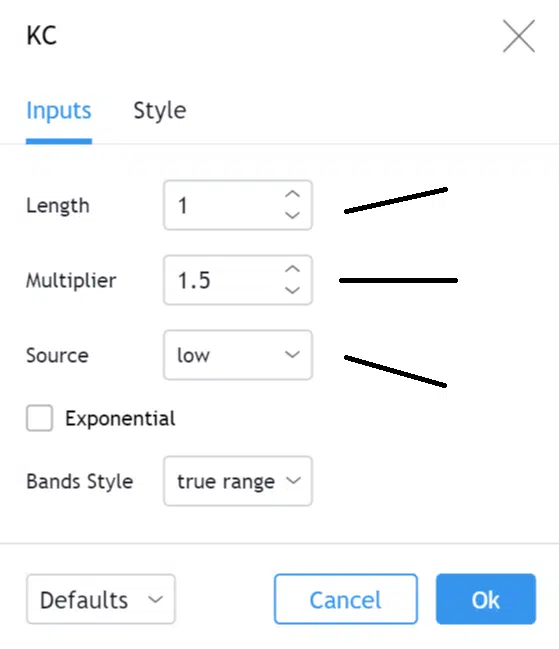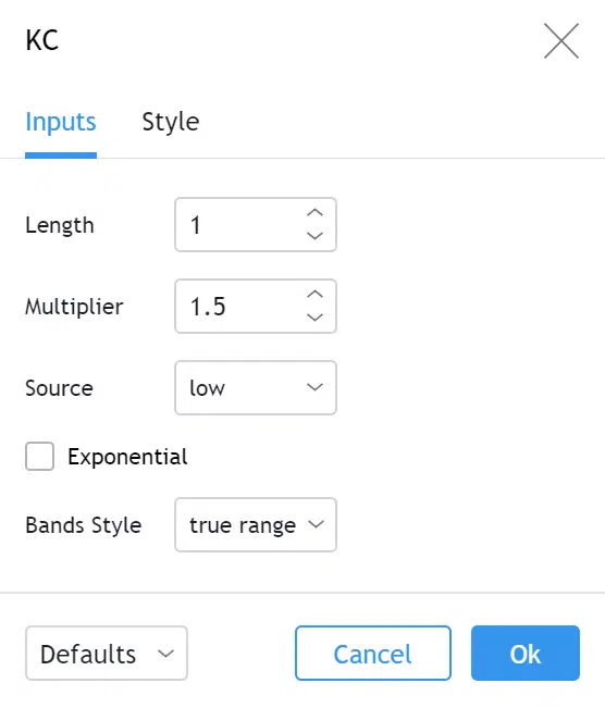 Für Short Positionen, also wenn Du auf fallende Kurse spekulierst, legst Du einen weiteren Keltner Channel in den Chart und nimmst die gleichen Einstellungen wie zuvor. Der Unterschied ist, dass Du die Haken bei Basis, Lower und Background entfernst. Es bleibt der Haken bei „Upper“.