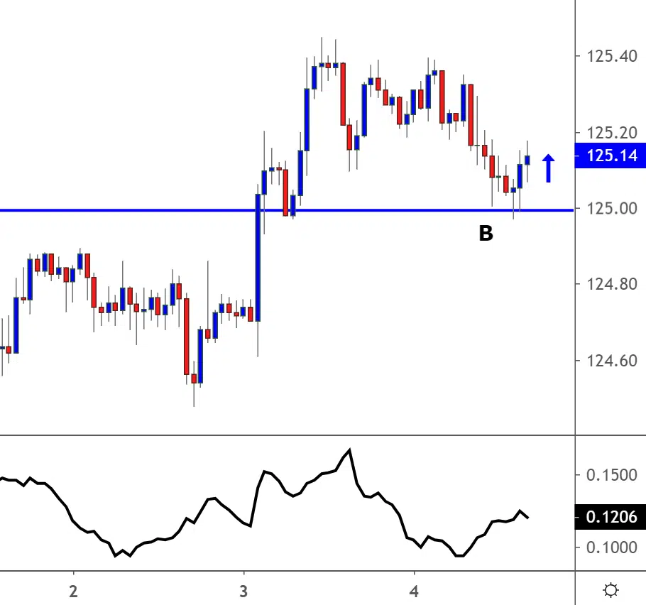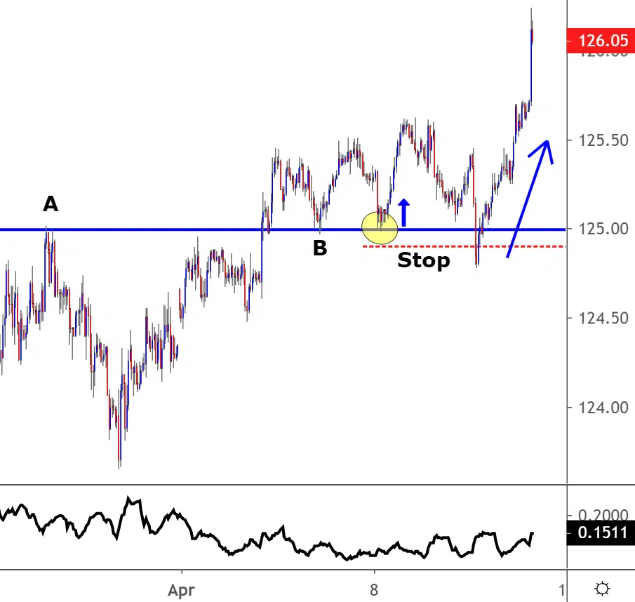 Der Widerstand wird nun zu einer Unterstützung. (Punkt B).