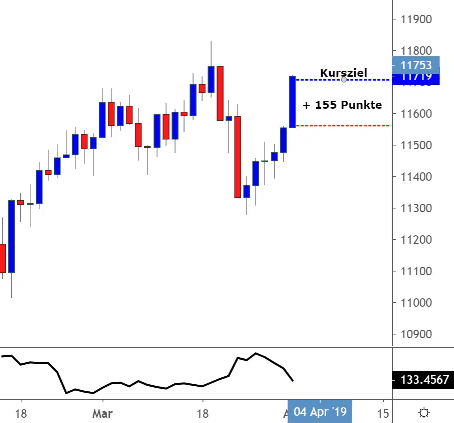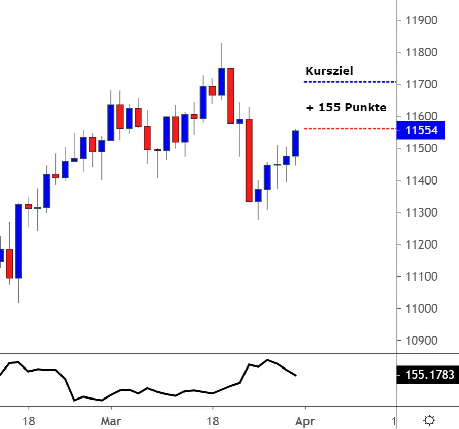 Der ATR zeigt Dir die Vola mit 155 Punkten an. Nun addierst Du die 155 Punkte auf den Schlusskurs vom DAX, der bei 11.554 geschlossen hat.
