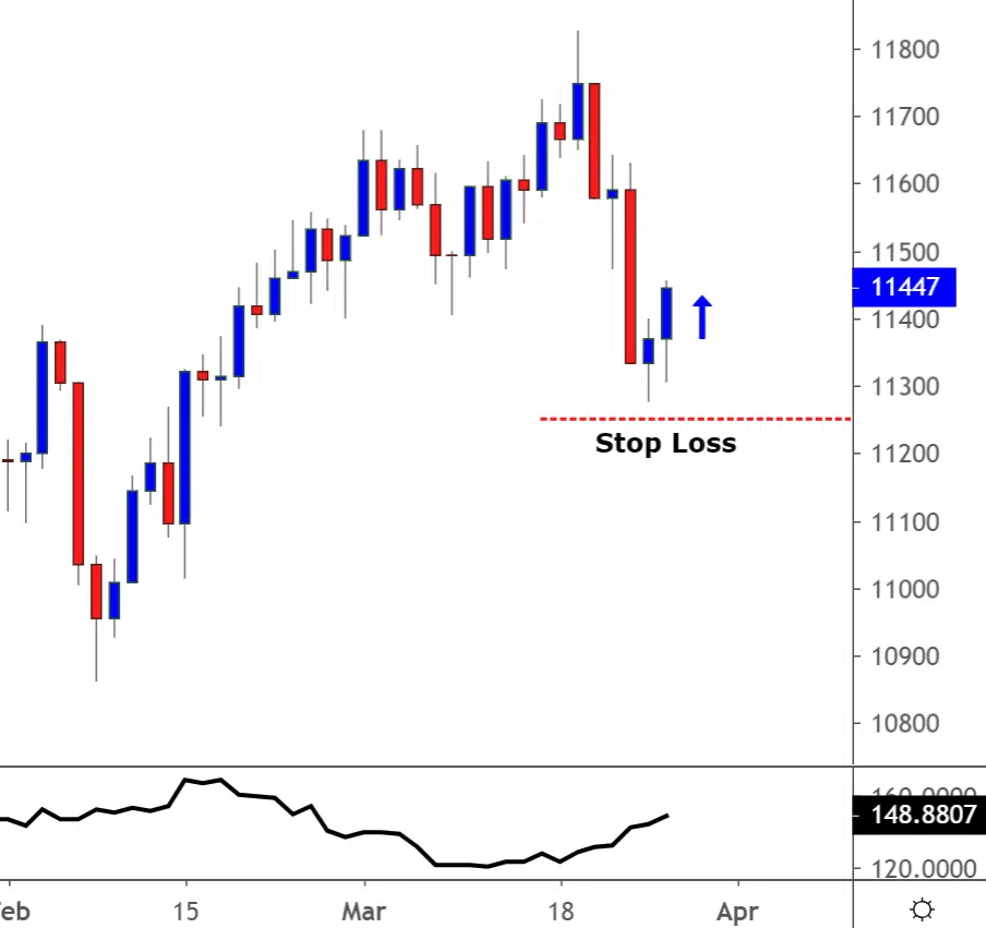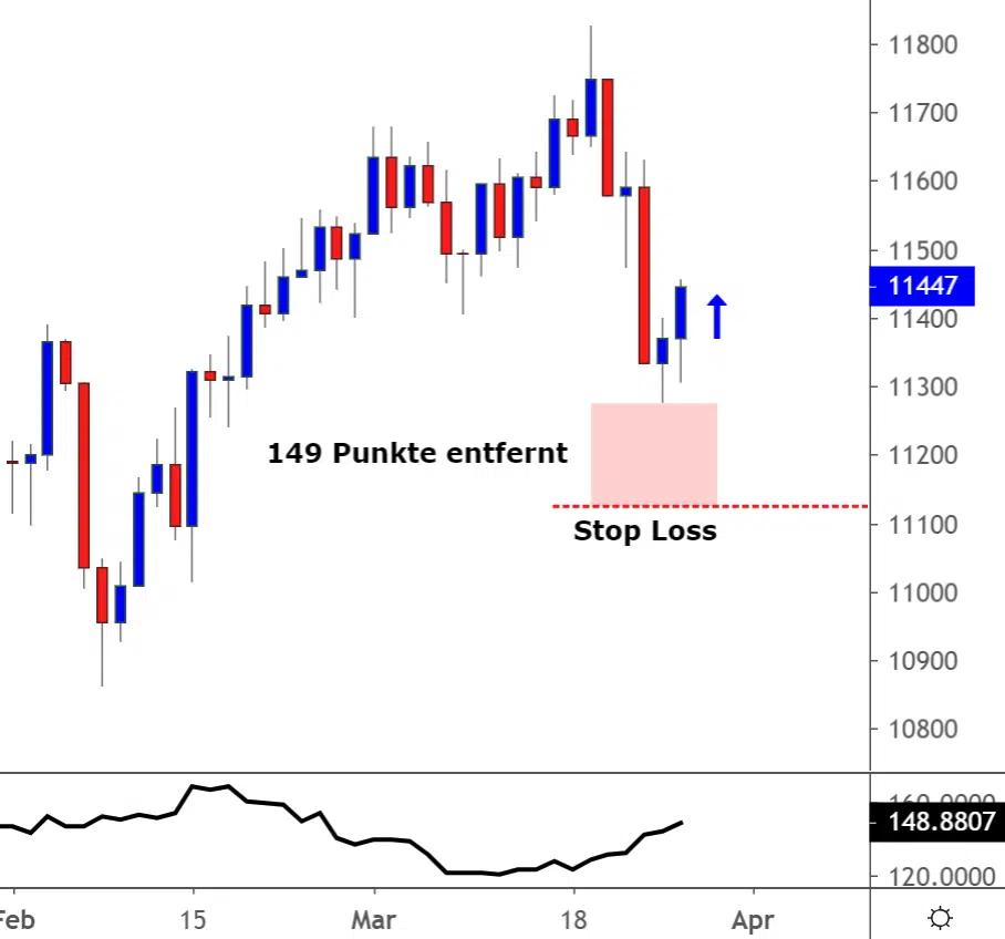 In diesem Beispiel setzen wir den Stopp also einfach 149 Punkte unterhalb des Tiefs.
