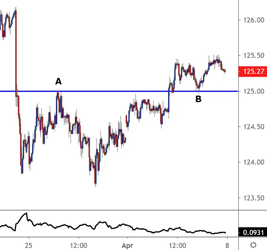 Der Punkt A markiert einen Widerstand. Im späteren Handelsverlauf wird dieser Widerstand überwunden.