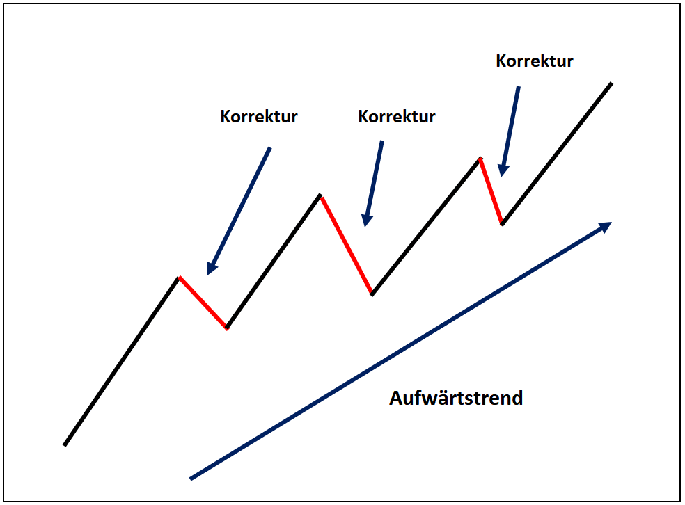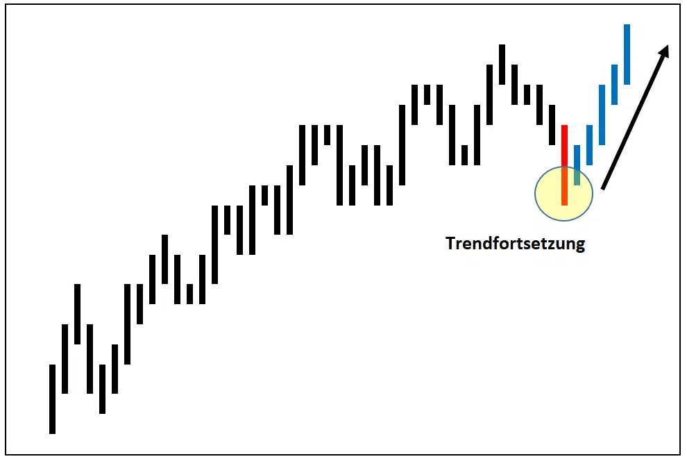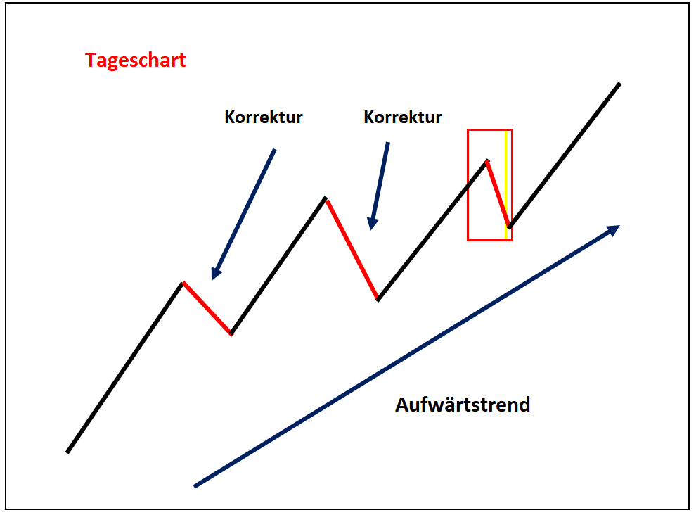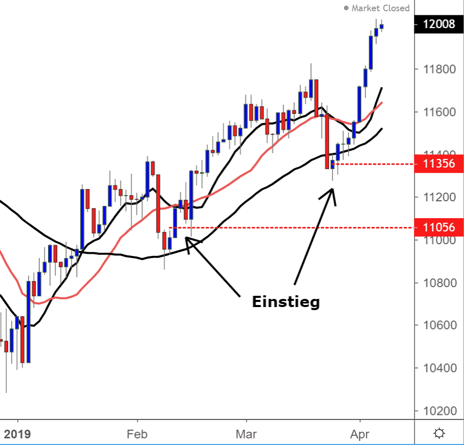 Mit diesem Einstieg kommst Du günstiger in den Markt. Falls es nicht klappt, ist der Verlust geringer. Zudem stehst Du nicht allein mit diesem Einstieg da – viele Marktteilnehmer kaufen in solche „Pullbacks“ der Kurse.