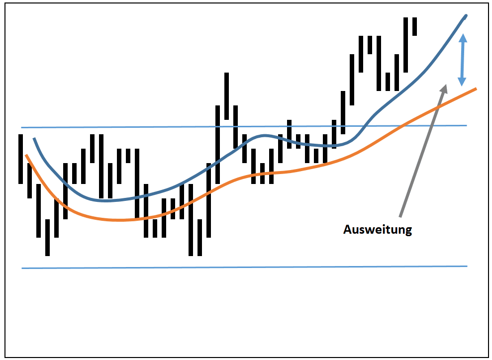 Die Wahrscheinlichkeit eines Fehlausbruches ist geringer, je weiter die Moving Averages auseinandergehen. Dieser Handelsansatz hat aber den Nachteil, dass die Ausweitung subjektiv und auch abhängig von der Chartskalierung ist.
