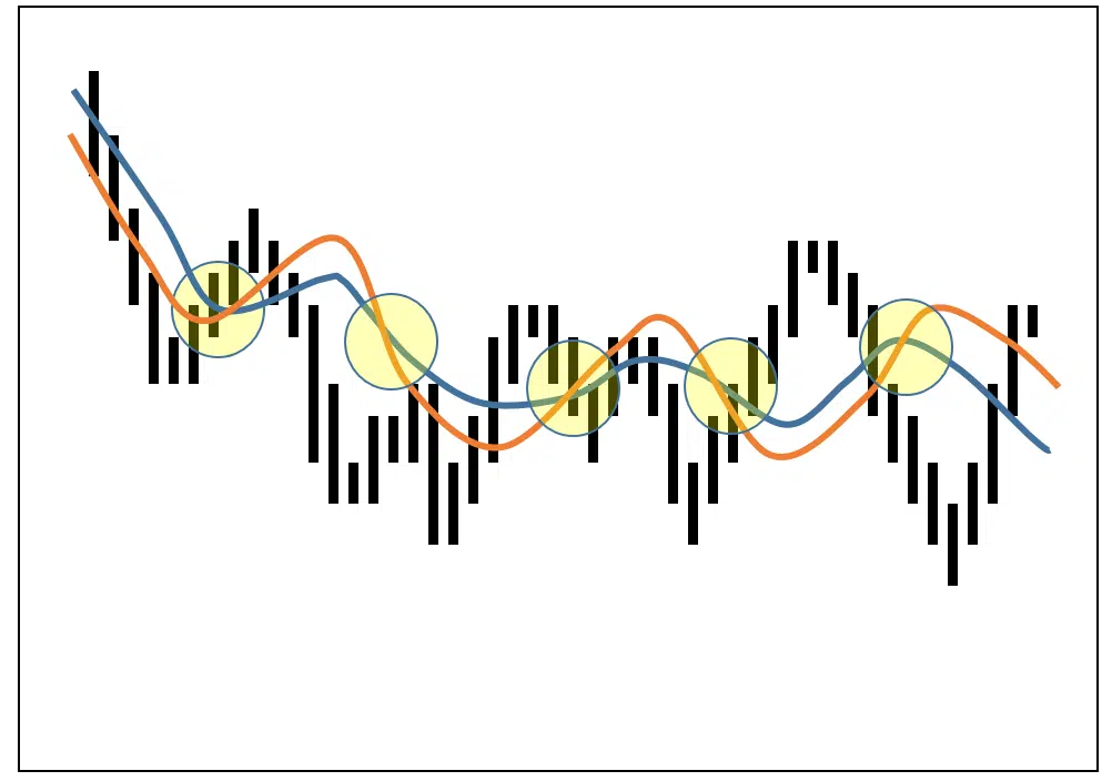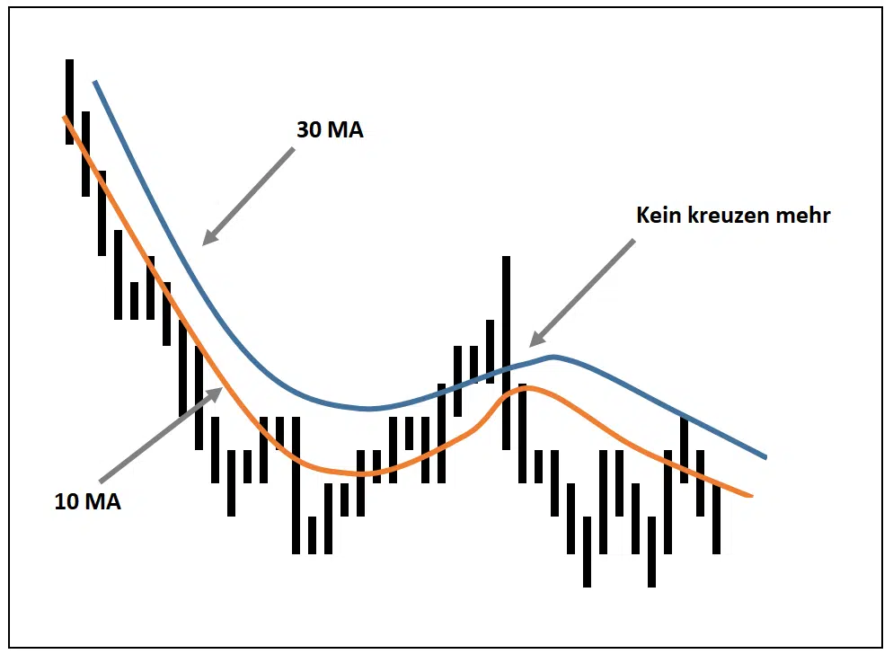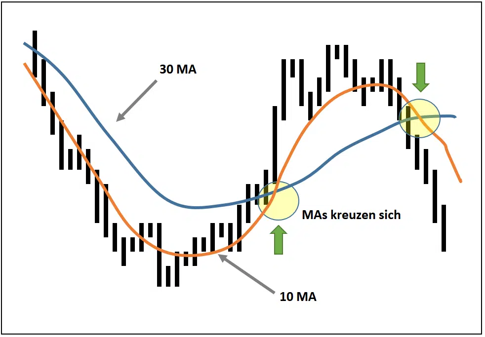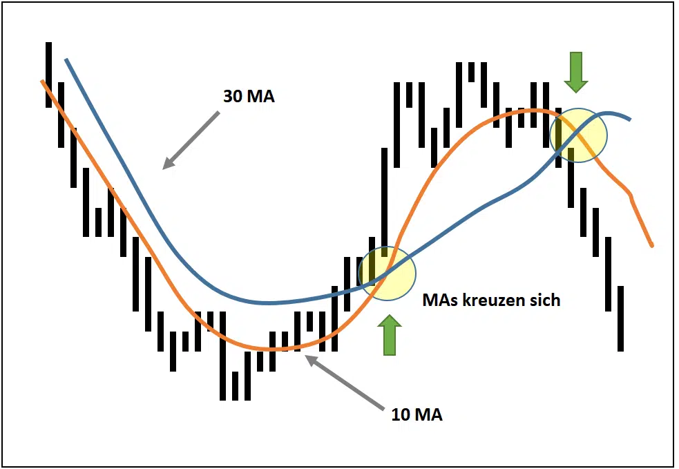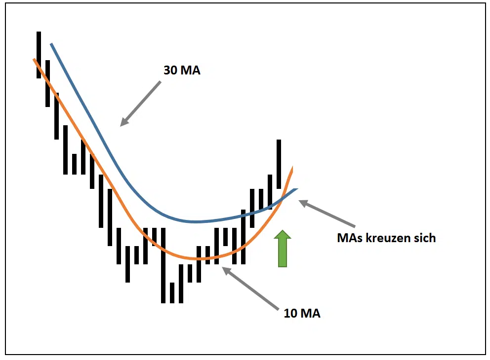 Wenn sich zwei Movings kreuzen, wird ein potenzieller Aufwärts- bzw. Abwärtstrend eingeläutet. Hierbei nutzt man einen MA, der eine längere Zeitperiode berücksichtigt und einen MA mit einer kürzeren Zeitperiode. Beispielsweise einen 30MA kombiniert mit einem 10MA.