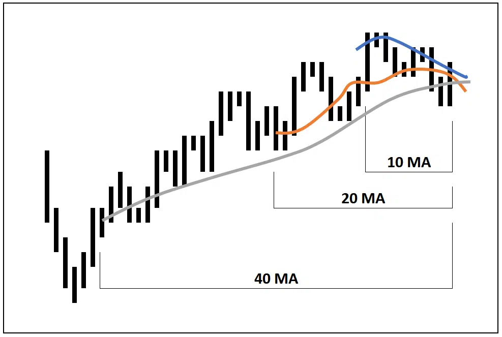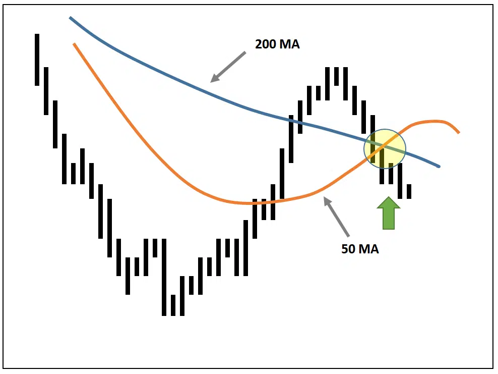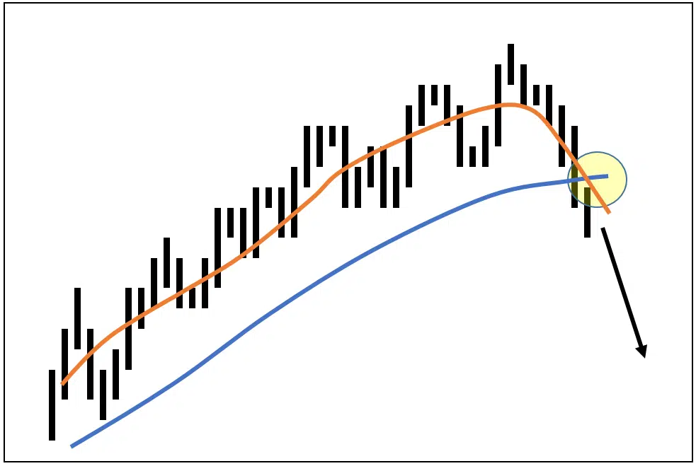 2. Man nutzt zwei Moving Averages. Einen MA, der eine längere Datenreihe beinhaltet, also einen längeren Zeitraum betrachtet. Beispielsweise einen 50MA und einen kürzeren MA, etwa einen 10MA. Da der 10MA schneller auf Kursveränderungen reagiert, fällt dieser auch schneller, wenn die Kurse fallen als der 50MA, der nicht so schnell reagiert. Resultat: Der 10MA durchkreuzt den 50MA von oben nach unten.