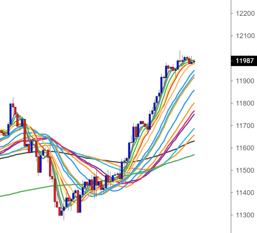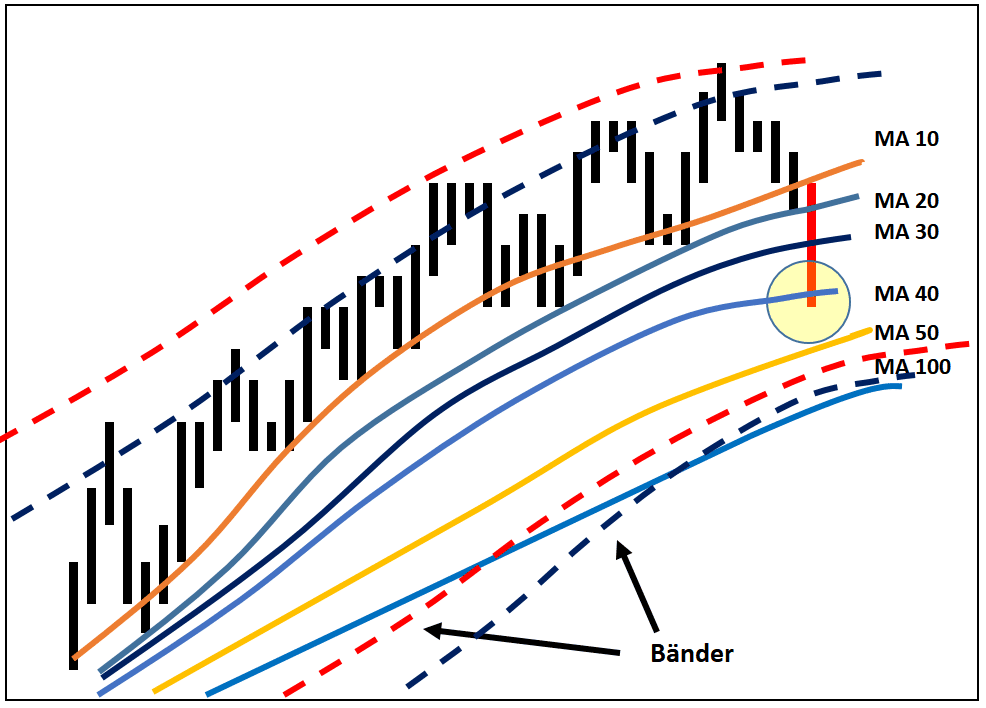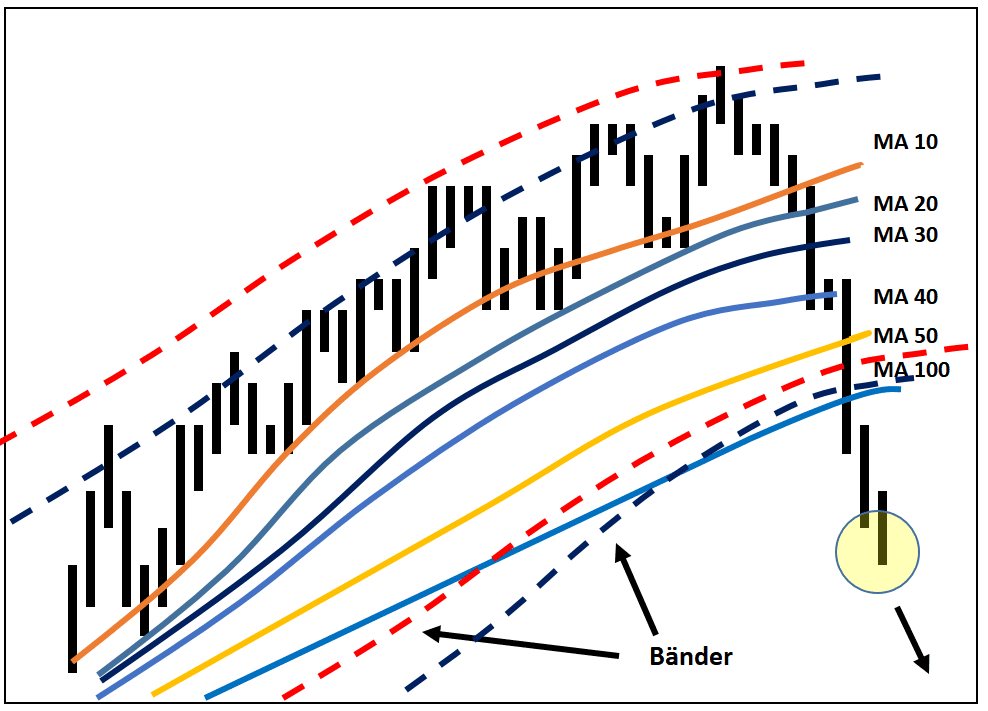 Grundsätzliches Konzept dahinter: Je weiter die Movings auseinandergehen, desto stärker ist der Trend. Ziehen sich die Movings wieder enger zusammen, schwächt sich der Trend ab.