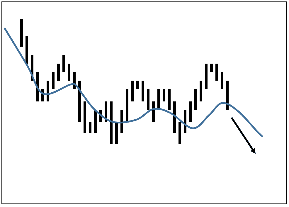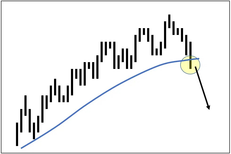 1. Nehmen wir an, der Markt steigt in einem etablierten Aufwärtstrend. Der MA folgt dem Kursverlauf. Sobald aber der Kurs unterhalb des MA schließt, also den MA von oben nach unten durchbricht und darunter schließt, ist der Aufwärtstrend gebrochen und es steht ein Trendwechsel bevor.