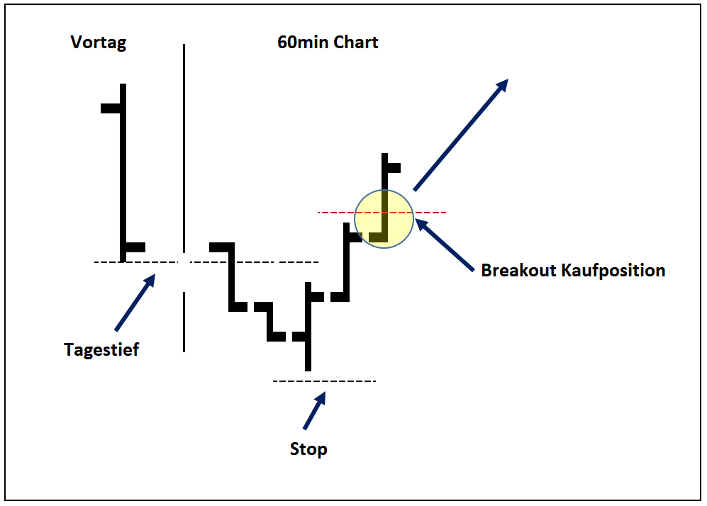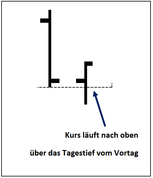 Nächster Handelstag: Der Markt macht neue Tiefs gegenüber dem Vortag, steigt dann aber wieder an. Wir haben jetzt eine Kaufposition.