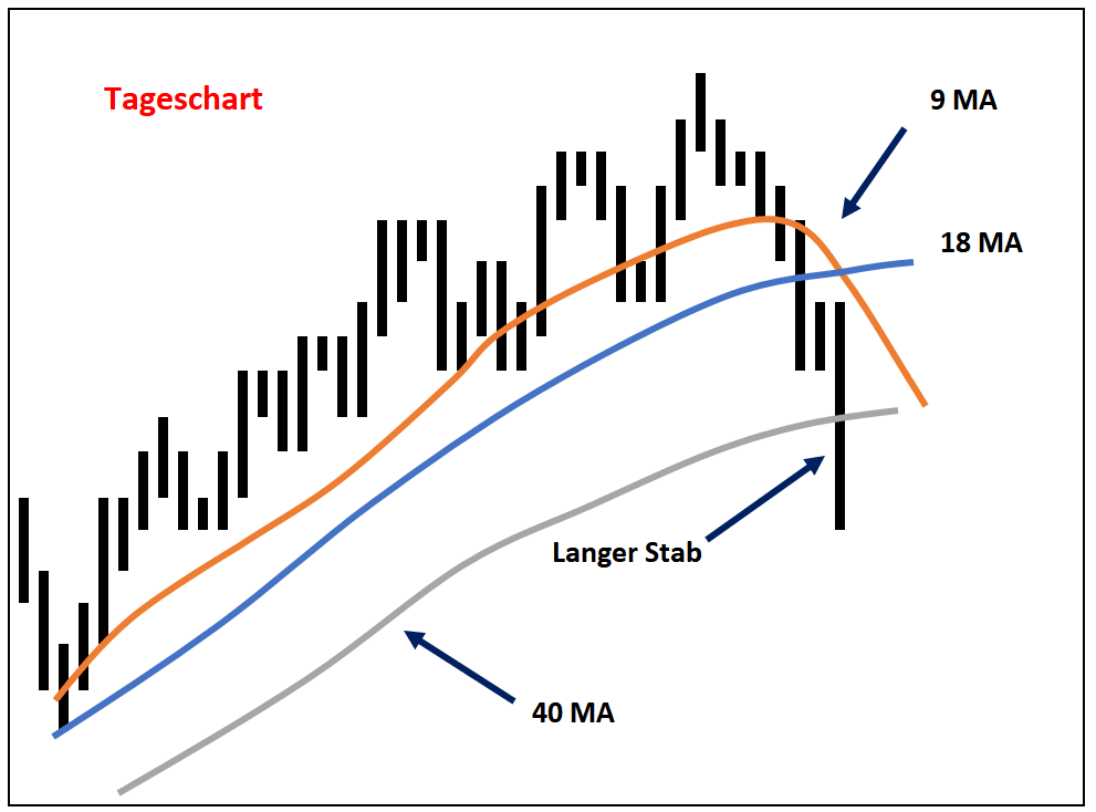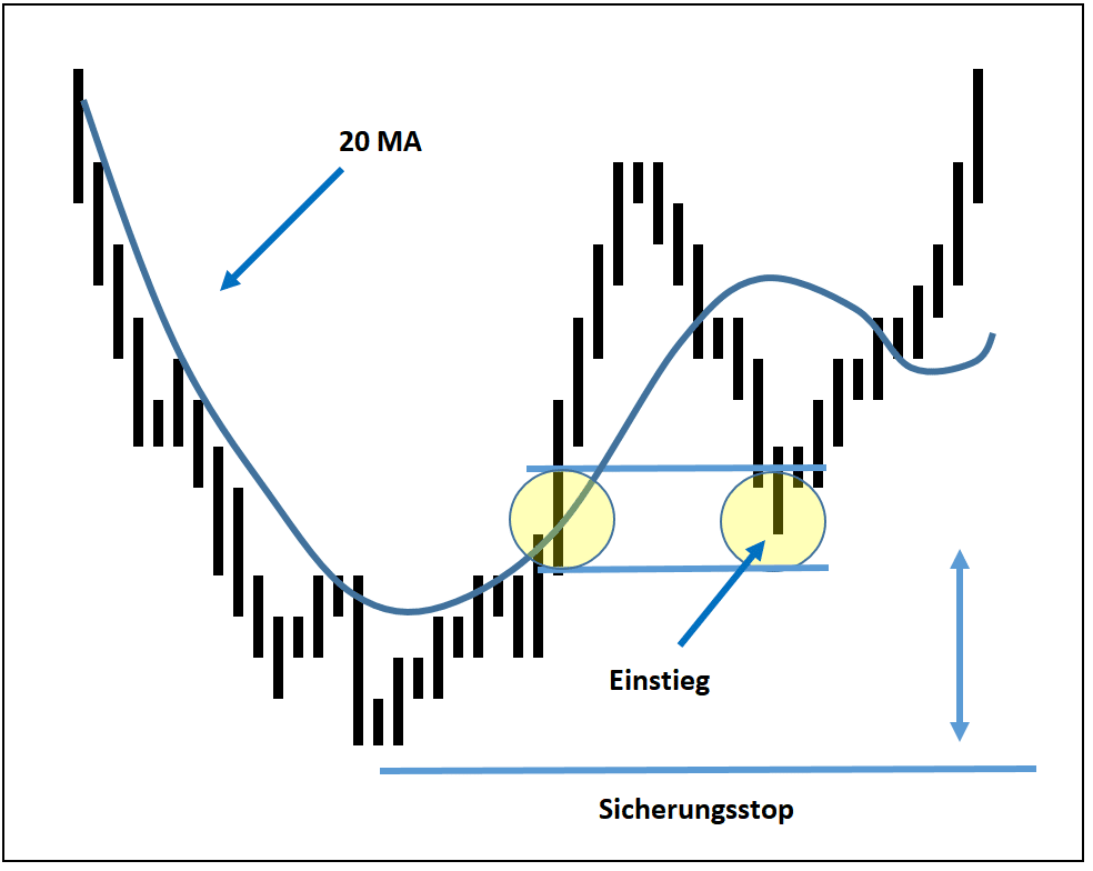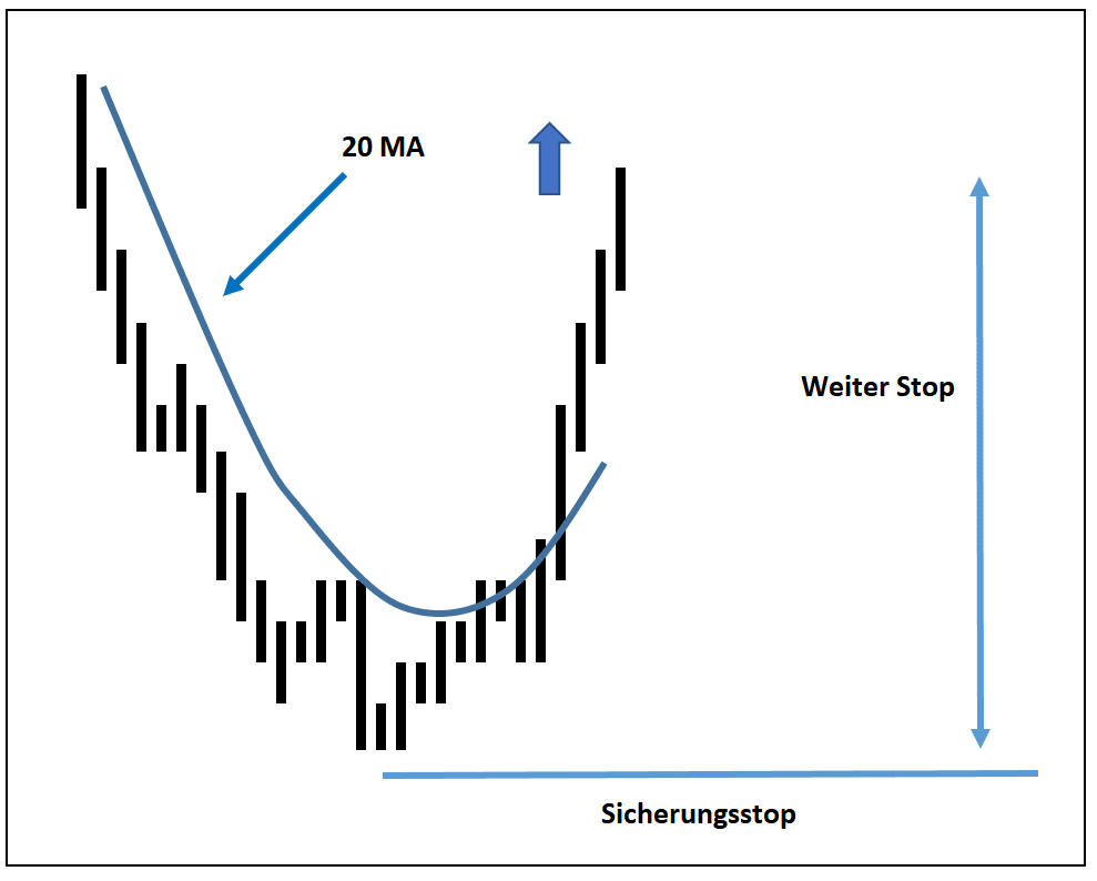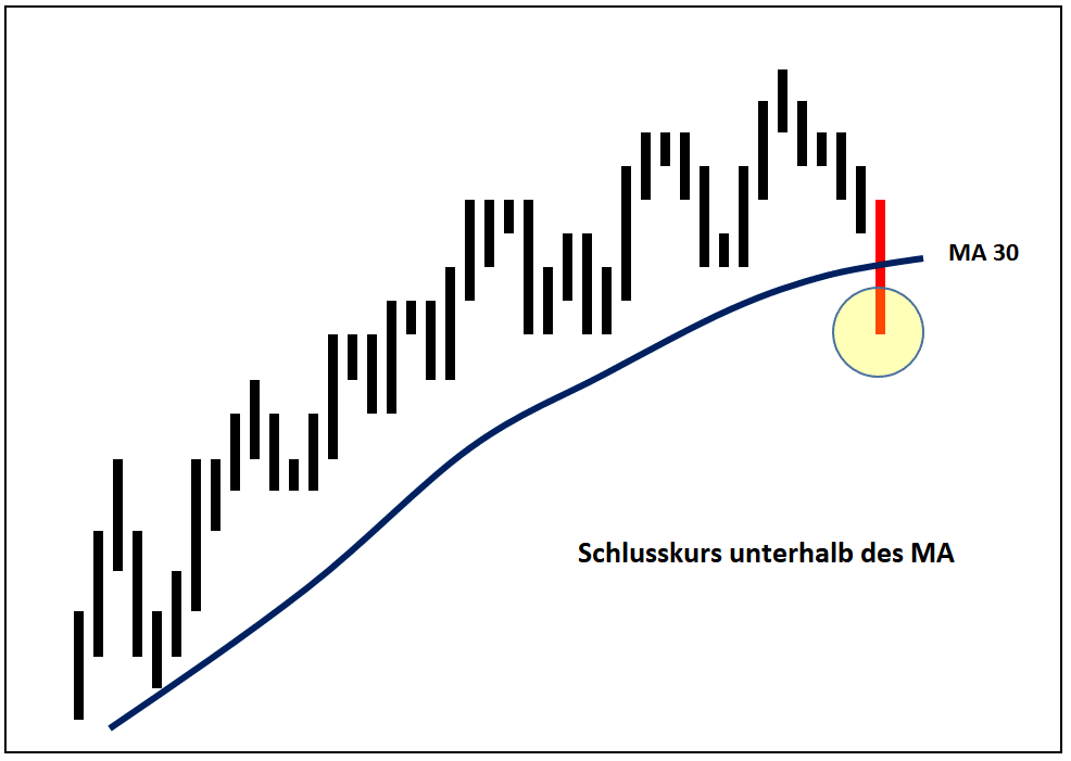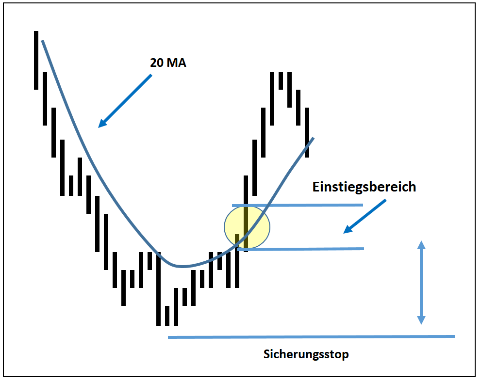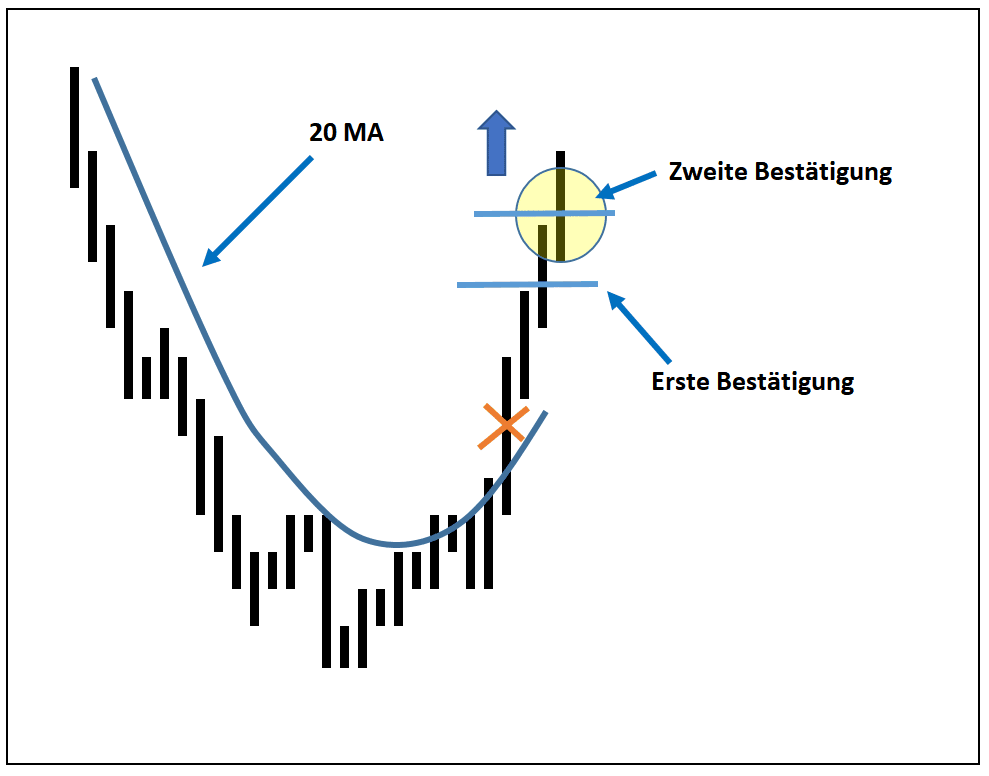 Voraussetzung ist ein Durchbruch des Kurses über den 20 MA mit einem Schlusskurs über dem Moving Average.