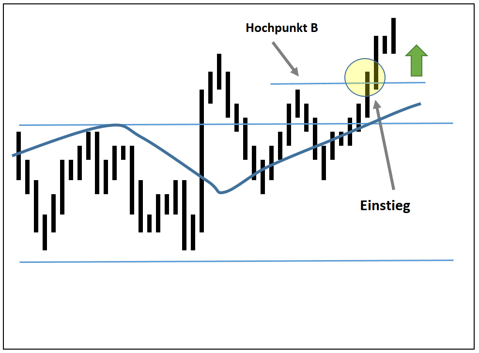 Der Einstieg erfolgt dann, wenn der Kurs über den Hochpunkt B handelt.