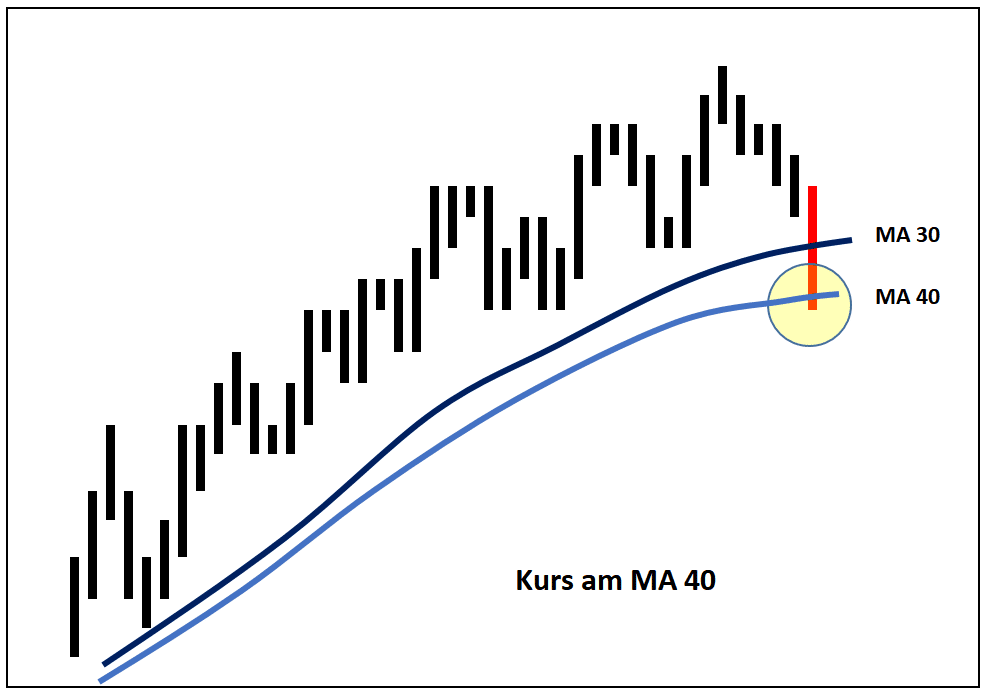 Besonders effizient ist der Trade, wenn die lange Kerze auch den 40 Moving Average