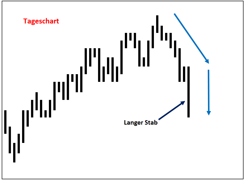Der aktuelle Handelstag schließt mit einer langen Kerze. Richtiger Ausverkauf! Die lange Kerze ist deutlich länger als die Kerzen zuvor. „Minicrash“ – alles spricht für weiter fallende Kurse!