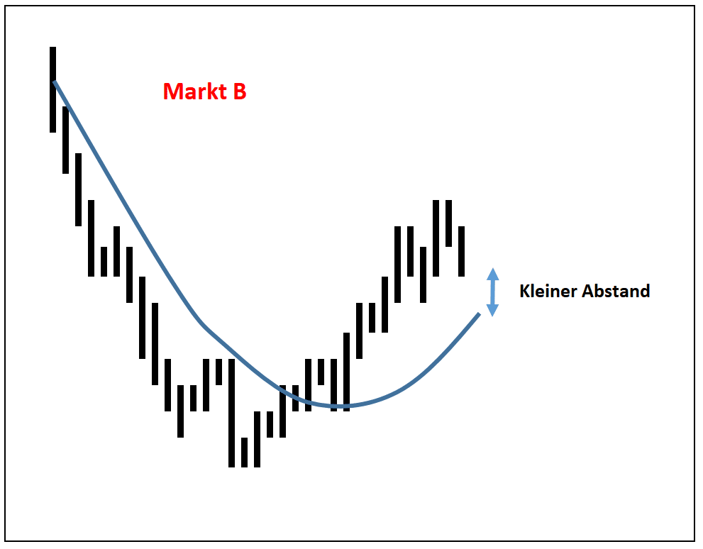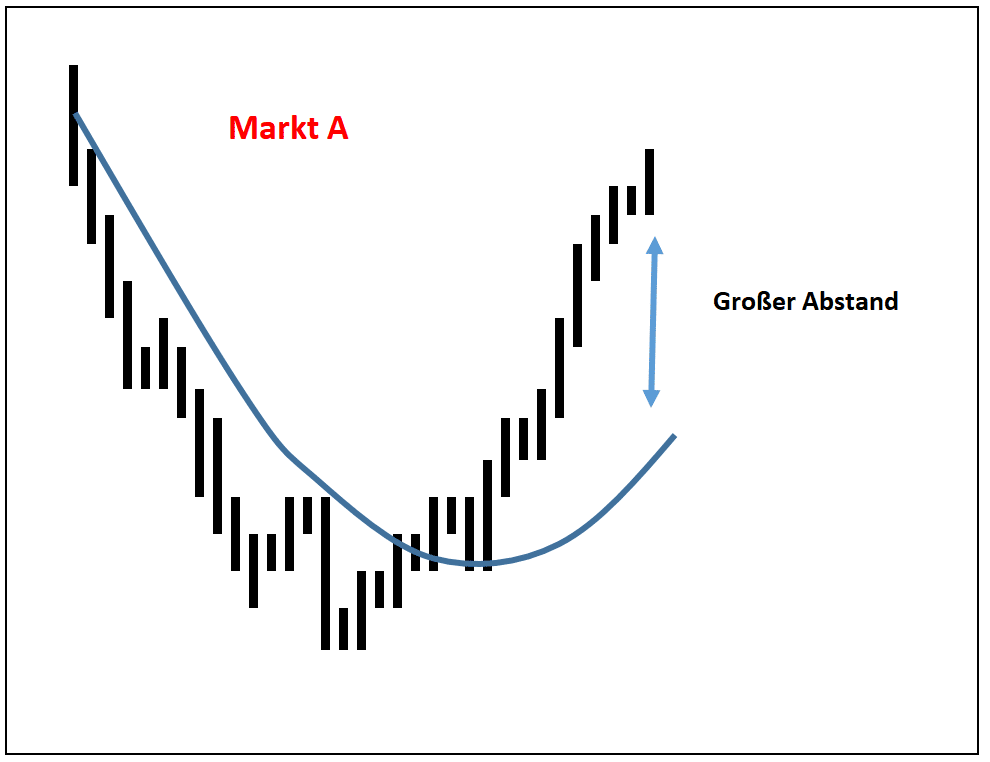 Der aktuelle Kurs (Markt A) hat einen größeren Abstand zum Moving Average als der aktuelle Kurs von Markt B zum Moving Average.