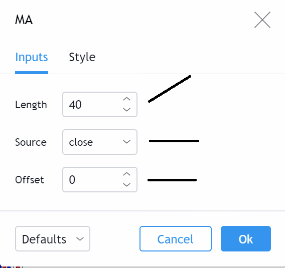 Mit einem Maus-Doppelklick auf den Moving Average öffnet sich das Einstellungsmenü: