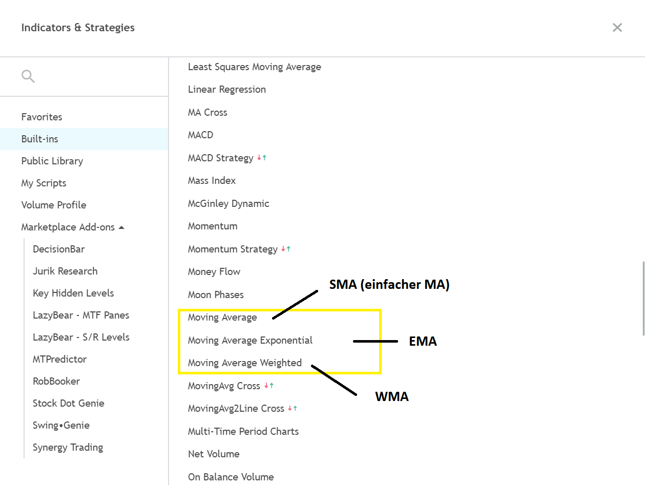 Unter der Rubrik „Indikatoren“ kannst Du entscheiden, ob Du einen einfachen Moving Average (SMA), einen EMA oder WMA auswählst.