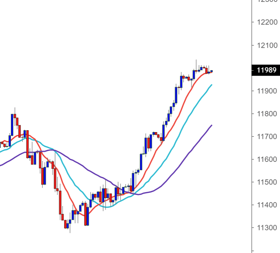 Vergleichst Du zwei Märkte miteinander, die einen ähnlichen Verlauf nehmen, also stark korrelieren, macht es Sinn für Dich, den Markt zu handeln, der ein stärkeres Momentum aufweist. Ein Moving Average kann Dir dabei helfen.