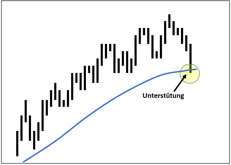 Weitere Rückschlüsse ergeben sich dadurch, ob und wie der aktuelle Kurs vom durchschnittlichen Kurs abweicht. Also ob der aktuelle Kurs über dem MA steht oder unter dem MA.