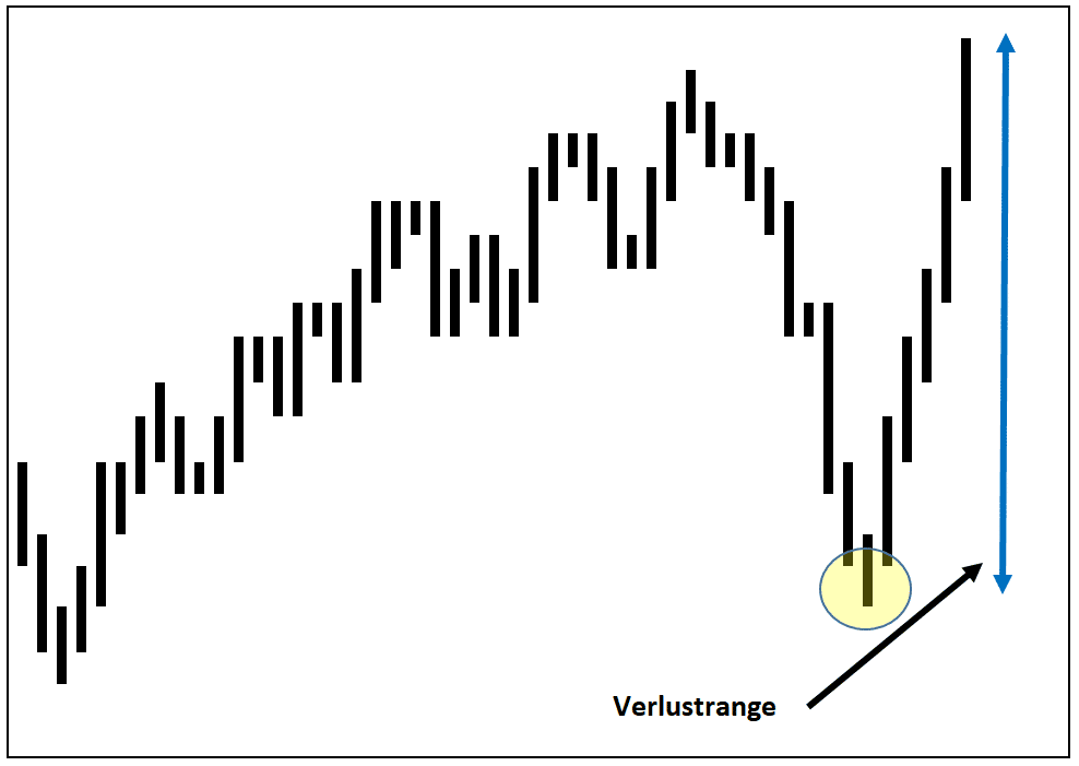 Möglich ist auch, dass der Folgetag nach neuen Tiefs nicht wieder anfängt zu steigen, sondern tiefer schließt. Trotzdem solltest Du dem Markt (nach der langen Kerze) weitere drei Tage für einen Anstieg Zeit geben.